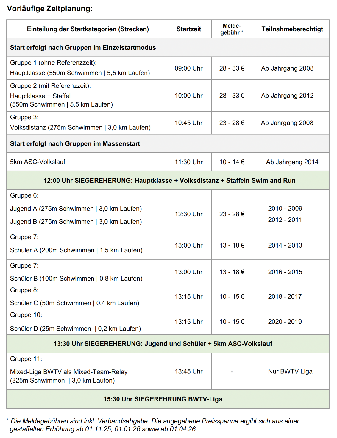 **Die Meldegebühren sind inkl. Verbandsabgabe. Die angegebene Preisspanne ergibt sich aus einer gestaffelten Erhöhung ab 01.11.25, 01.01.26 sowie ab 01.04.26.